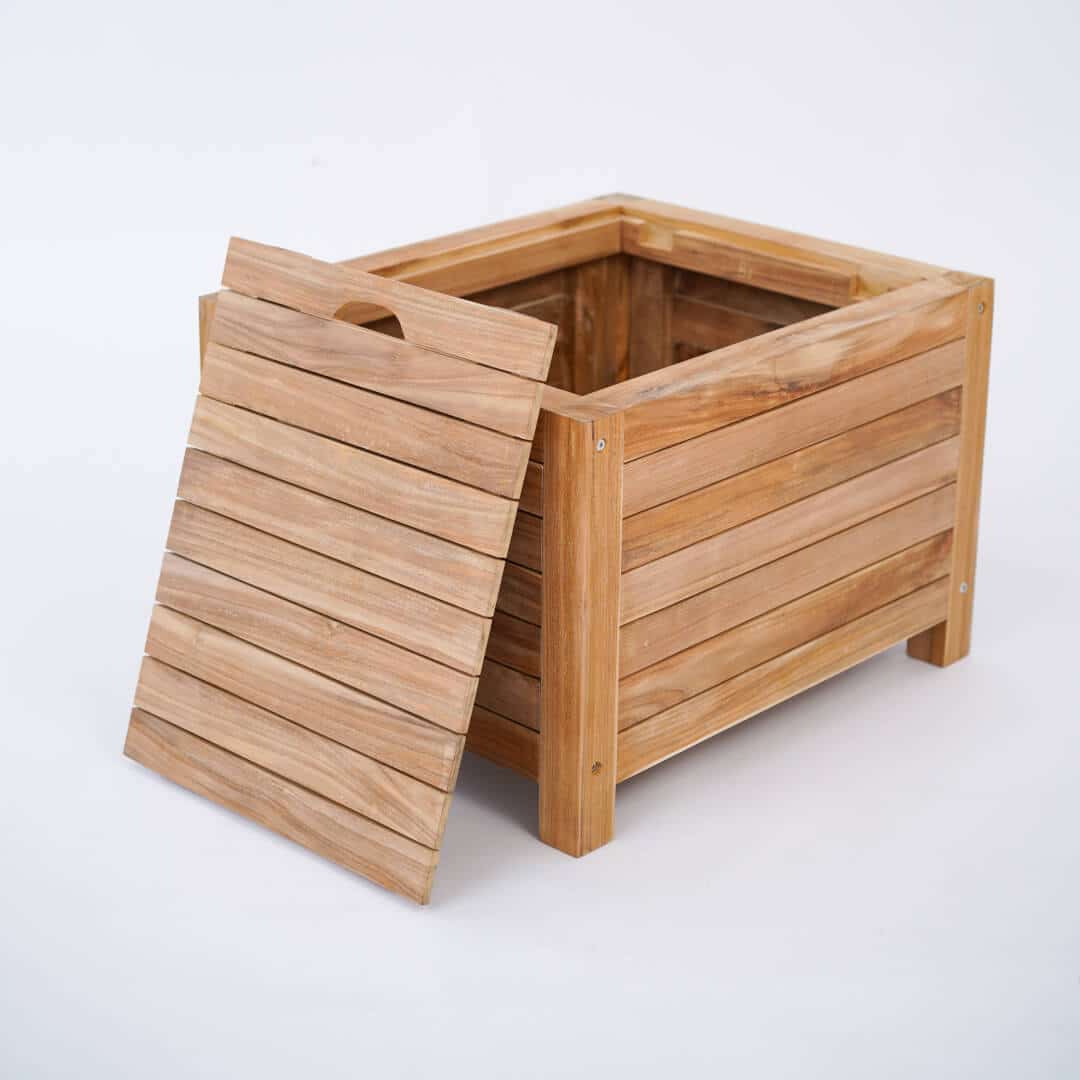 Teakhouten balkonhocker met opbergruimte van 60 x 60 x 40 cm. Voetenbank, balkontafel én extra balkonzitje in één!